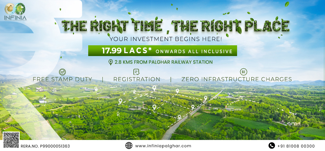 Own a part of PALGHAR’S MOST AWAITED DEVELOPMENT. Infinia offers you NA plots with stunning hill views in a cluster destined to be the region’s biggest growth story. The project is located in the heart of a green expanse yet JUST 5 MINUTES FROM PALGHAR RAILWAY STATION. It has the ideal setting for ECO-FRIENDLY URBAN LIFE. Also, each plot comes with individual ownership (i.e. seperate 7/12 & Survey map) and is located 2 hours from Mumbai, becoming the perfect investment destination.